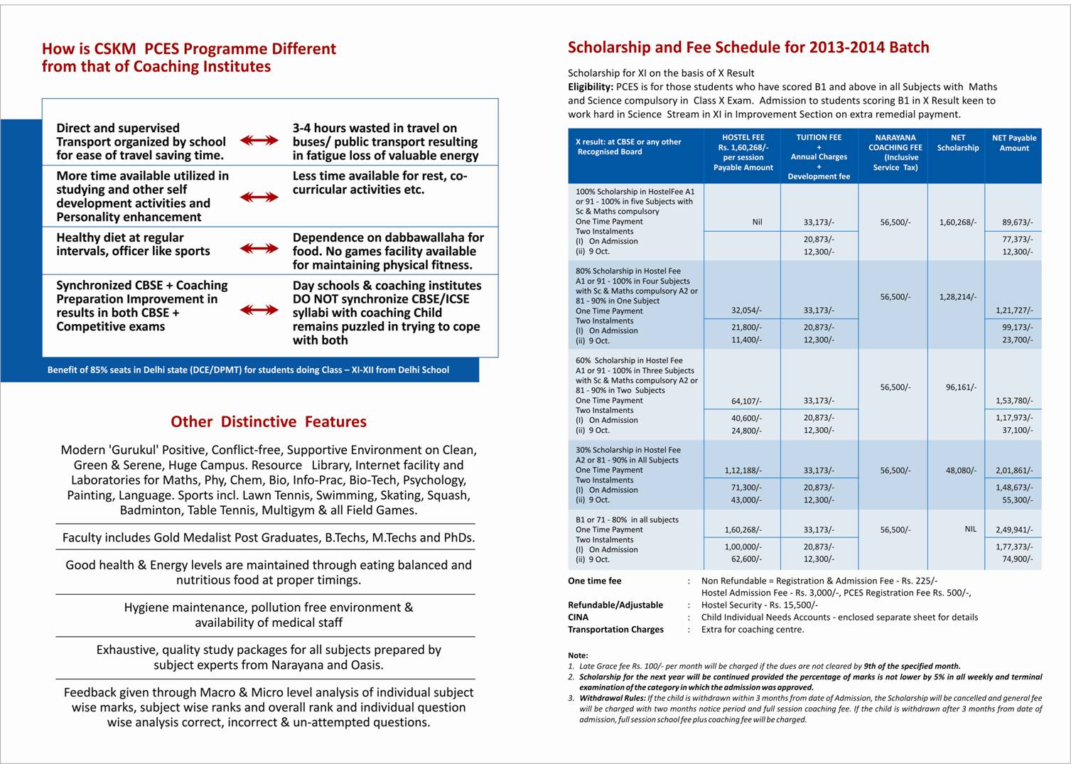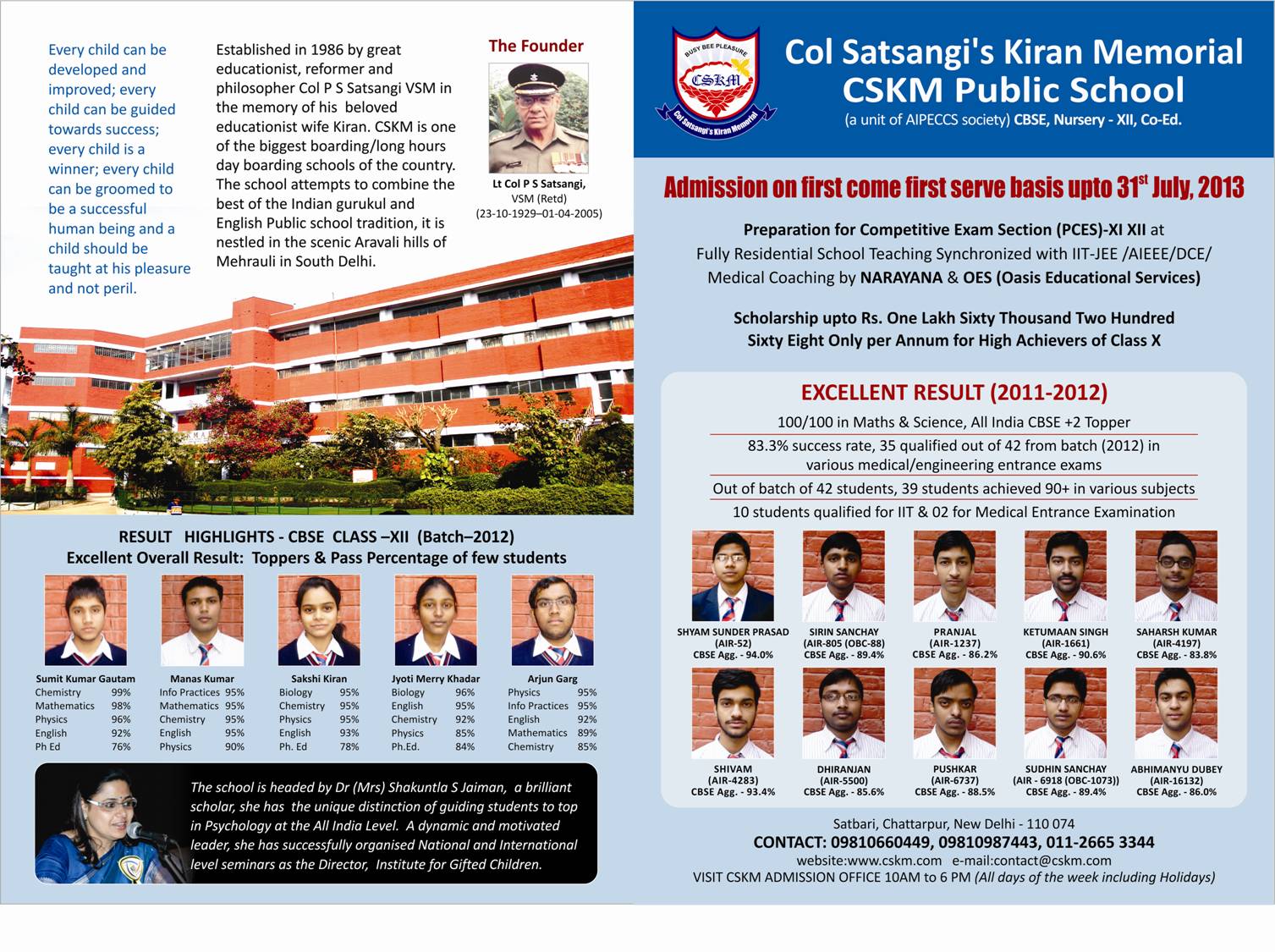As part of our efforts to encourage the meritorious students, Col Satsangi’s Kiran Memorial (CSKM) Public School has offered the following scholarship scheme on the basis of on-campus Aptitude and Proficiency Test. Students qualifying the online screening test to be held on 5th May to 25th May, 2013 advertised in Hindustan Times & Hindi Hindustan dated 5th May, 2013 and Dainik Jagaran dated 5th May, 2013 are eligible